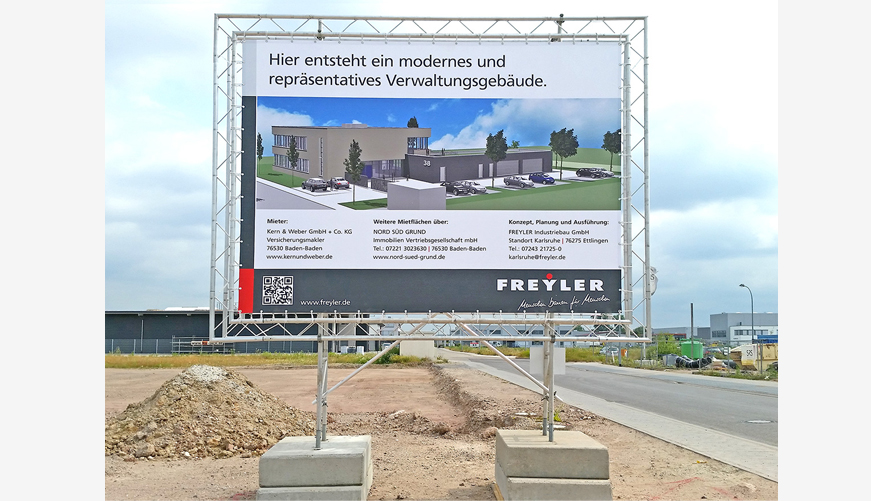 Ihre Werbung wird auf eine hochwertige Plane aufgedruckt und durch ein Fixierungssystem fest mit der Halterung verbunden. Gedruckt wird mit modernsten und umweltfreundlichen Druckern, so wird der Druck brillant und langlebig. Jedes denkbare Format ist möglich, das ermöglicht Ihnen einen absolut flexiblen Einsatz. Als Unterkonstruktionen kommen modulare Aluminiumfachwerke zum Einsatz, montiert auf mobilen Betonfundamenten und sind statisch berechnet. Die Angebotspreise verstehen sich einschließlich Transport zum Aufbauort, Montage, Vorhaltung während der Mietzeit, Abbau und auf Wunsch Zuführung der Schilder in eine umweltgerechte Wiederverwertung.